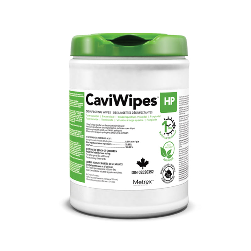 - Le désinfectant de surfaces CaviWipes™ HP offre un temps de contact universel d’une minute contre 67 pathogènes répertoriés, grâce à sa formulation à base de peroxyde d’hydrogène.