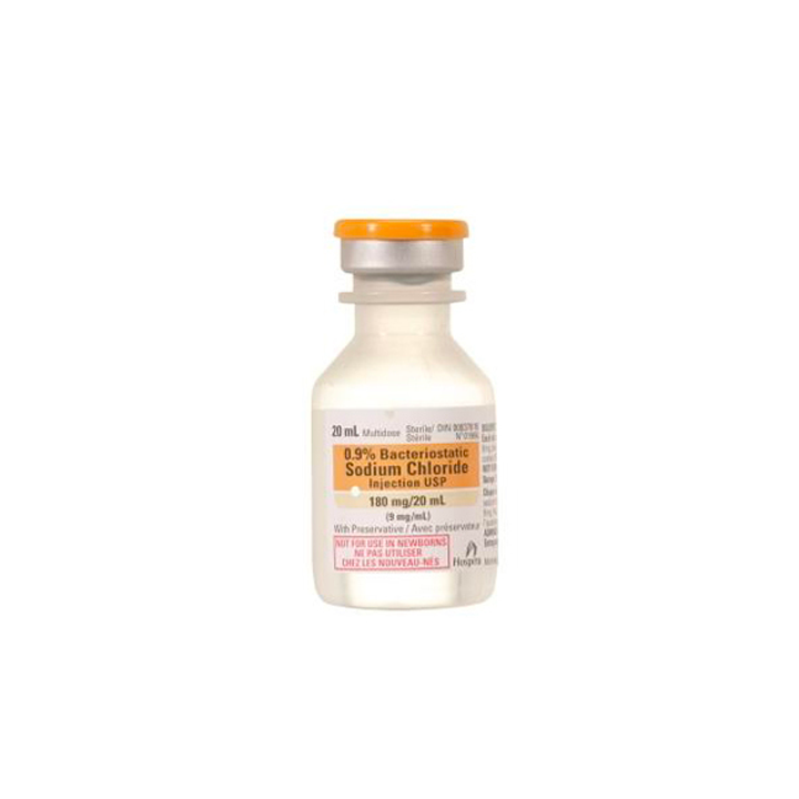 Flacons d’eau bactériostatique 0,9 % chlorure de sodium pour injection, avec conservateur – 20 ml, 25 unités/boîte